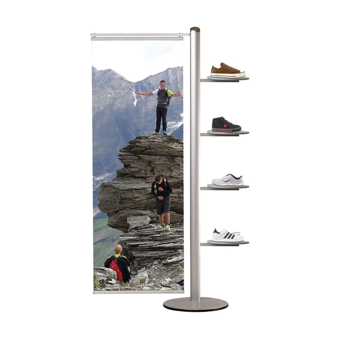 Unser eleganter und hochwertiger indoor Werbeständer, bestehend aus einem eloxierten Aluminiumständer, Bannerschienen und 4 Rundregalen, bietet Ihnen die Möglichkeit Ihre Produkte außergewöhnlich in Szene zu setzen. Präsentieren Sie gezielt Ihre Produkte oder Marke und wecken Sie mit Bildern oder Botschaften die Emotionen Ihrer Kunden.