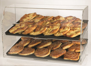 Das Theken-Food-Display Pro aus Acryl ist die perfekte Lösung für eine hygienische und ansprechende Präsentation von Backwaren, Snacks und belegten Brötchen. Dank der 2 schrägen Fachböden wird Ihre Ware optimal sichtbar ausgestellt und wirkt dadurch besonders appetitlich. Ob Donuts, Croissants, Kuchenstücke oder Sandwiches – Ihre Produkte ziehen die Aufmerksamkeit Ihrer Kunden auf sich und regen direkt zum Kauf an.
