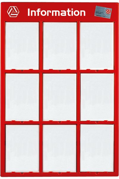 Info-Board - 9 x A4 Aus 3 mm PS in Rot. Mit 9 Stück entspiegelten APET Frontscheiben. Prospekthalter ist leicht an allen Flächen anzubringen. Eigen...