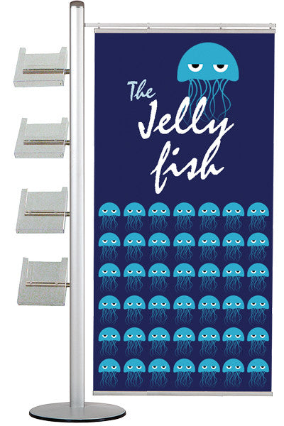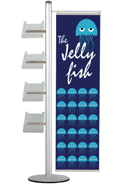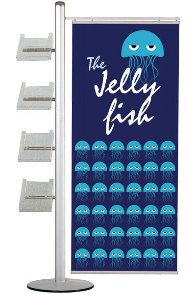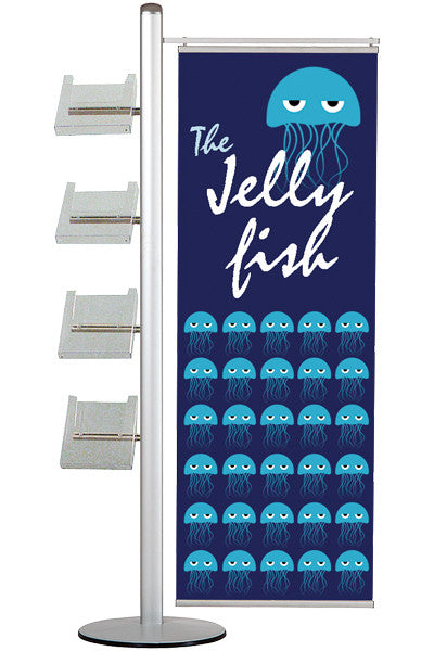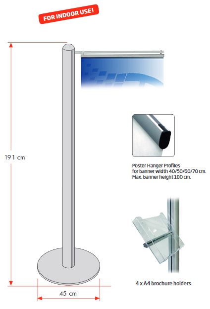 Unser eleganter und hochwertiger indoor Werbeständer, bestehend aus einem eloxierten Aluminiumständer, 4 x A4 Prospekthalter und einer Bannerleiste bietet Ihnen die Möglichkeit Ihre Produkte außergewöhnlich in Szene zu setzen. Präsentieren Sie gezielt Ihre Produkte oder Marke und wecken Sie mit Bildern oder Botschaften die Emotionen Ihrer Kunden.