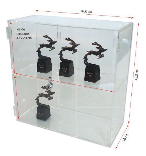 Dieser Schaukasten ermöglicht Ihnen, Ihre Produktgruppen elegant in Szene zu setzen. Der Schaukasten ist ein Muss für jeden Schmuckladen, Museum oder Sammlergeschäft. Sie wertet die zur Schau gestellten Gegenstände gegenüber dem Kunden erheblich auf und schützt durch ihr Schloss hochwertige Produkte vor dem Diebstahl. Die Acryl-Vitrine findet auf Grund ihrer kompakten Größe Platz auf jedem Thresen oder auch auf Ihrer Verkaufstheke im Kassenbereich.