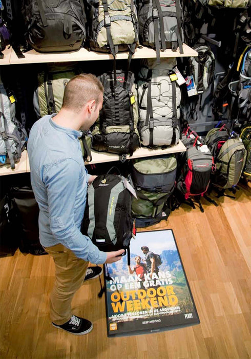 Die Oberfläche ist kratzfest und langlebig, während die Unterseite mit NFSI-zertifiziertem rutschfestem Material für höchste Sicherheit sorgt. Der Plakatwechsel erfolgt im Handumdrehen: Matte leicht anheben, Poster einlegen, fertig. Im Gegensatz zu Bodenaufklebern lässt sich die Werbematte jederzeit reinigen, umplatzieren und wiederverwenden – ohne Rückstände.