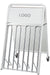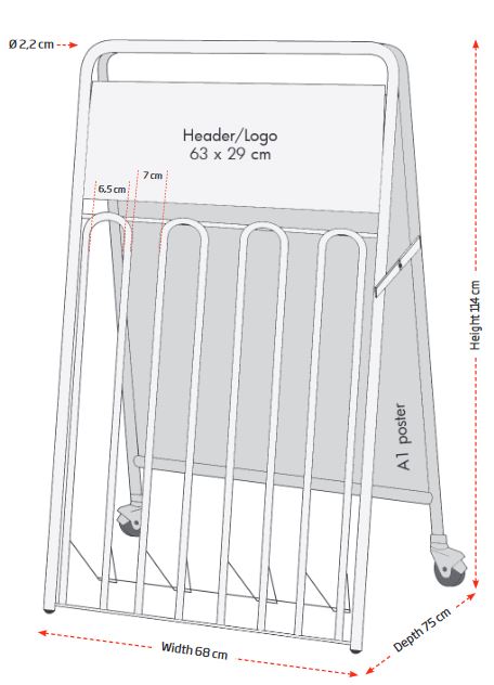 Dank der mitgelieferten Räder und Bremsen ist der Fahrradständer einfach zu bewegen und kann je nach Bedarf verschoben werden. Die entspiegelte APET-Frontplatte mit Magnet ermöglicht eine schnelle und einfache Änderung der Beschilderung. Mit der optionalen Logoplatte kann der Fahrradständer personalisiert werden, um die Markenbekanntheit zu steigern und ein professionelles Erscheinungsbild zu gewährleisten. Der Drahtkorb oder Broschürenhalter für Prospekte ist zudem als Zubehör hier erhältlich bietet eine nützliche Ergänzung, um Ihre Kunden und Gäste mit relevanten Informationen zu versorgen.