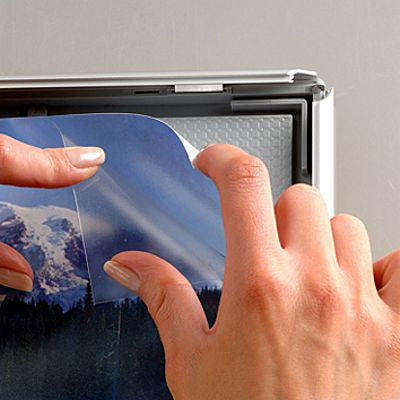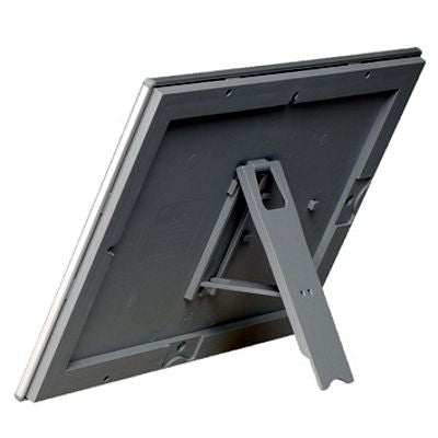 Das Austauschen von Fotos erfolgt blitzschnell. Klappen Sie dazu alle vier Seiten auf und entfernen Sie die Frontscheibe, setzen Ihr Poster ein und klappen Sie die Seiten wieder zu. Die Frontscheibe hat eine entspiegelnde Funktion. Somit sind Ihre Fotos auch bei Sonneneinstrahlung immer erkennbar. Die Rückplatte ist aus grauem Polystyrol und die Ecken auf Gehrung. Der Klapprahmen lässt sich dank seiner Stütze vertikal als auch horizontal aufstellen.