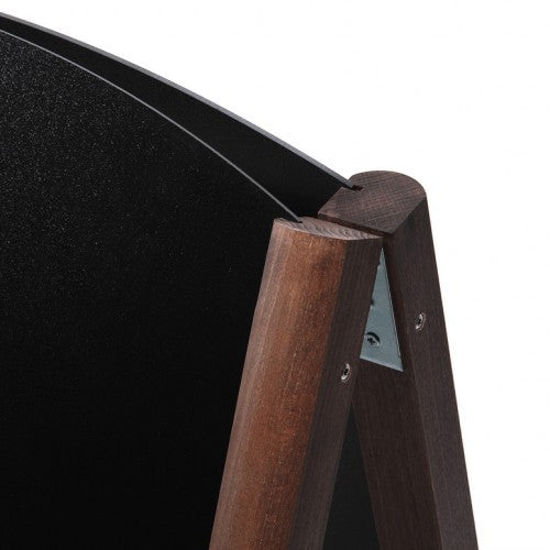 Elegante Gehwegtafel / Kundenstopper mit abgerundetem Top. Mit dunkelbraun lackiertem, abgerundetem Holzrahmen, beidseitig nutzbar. Die Oberfläche von 600 x 1010 mm ist abwischbar und wieder beschreibbar.