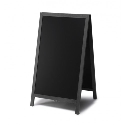 Edler Kundenstopper / Gehwegtafel aus Holz mit schwarz lackiertem, flachem Rahmen. Die Tafeloberfläche von 600 x 1010 mm ist beidseitig nutzbar im Innen- wie Außenbereich.