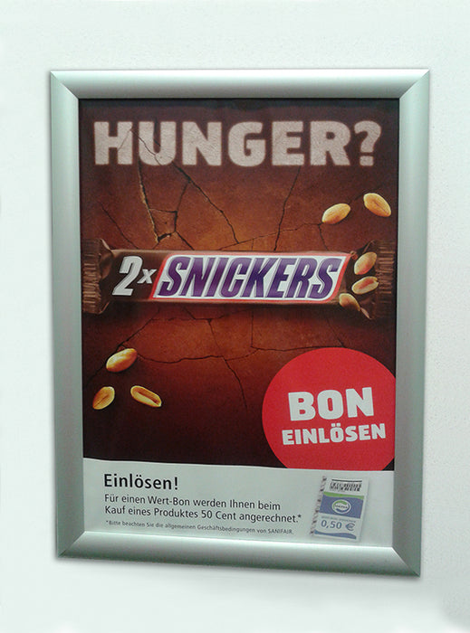 Unseren Rahmen können Sie als Werbefläche für Ihr Unternehmen nutzen. Hängen Sie den Rahmen im Wartezimmer oder in Fluren auf und zeigen Sie Ihren Kunden die aktuellen Projekte, Produktvorstellungen oder Informationen. Durch seinen schicken und edlen silbernen Rahmen eignet sich der Rahmen auch ideal als Dekorationselement zusammen mit einem schönem Natur-Poster in einer Boutique, Hotel oder einem Museum.
