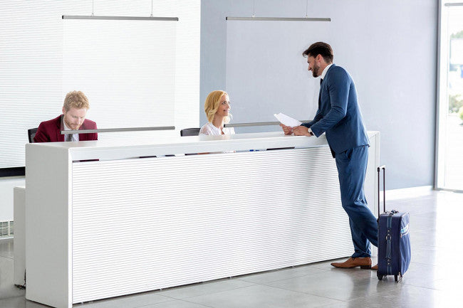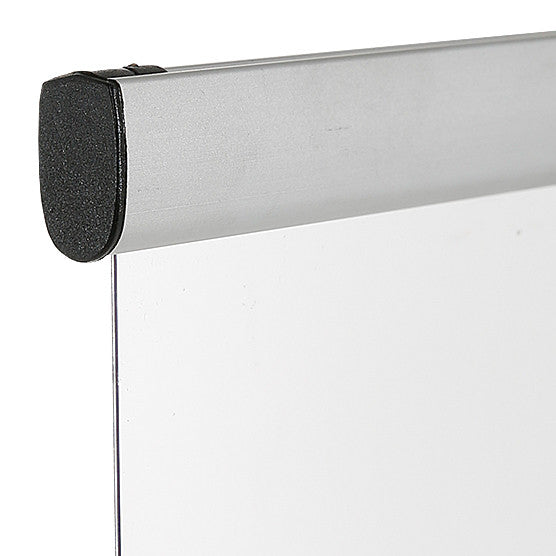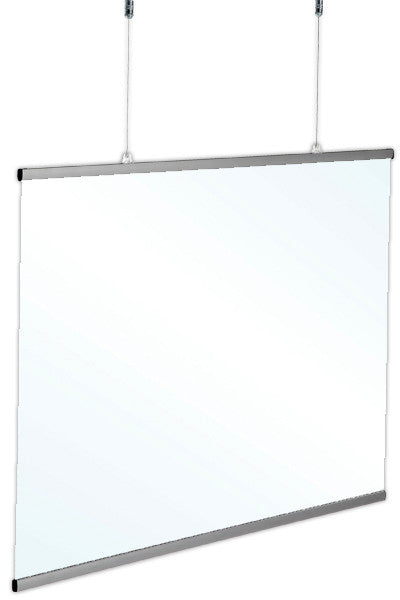 Spuckschutz-Scheibe für die Deckenabhängung - Optimal für Kassenbereiche und Informationsschalter. Zuverlässiger Spuck - und Spritzschutz für Kunden und Mitarbeiter vor husten und niesen. Die stabile PET-Scheibe hat jeweils oben und unten Aluminium-Profile und kann mit der mitgelieferten Draht-Aufhängung an die Decke gehängt werden. Der mitgelieferte Draht zum Aufhängen ist höhenverstellbar.