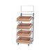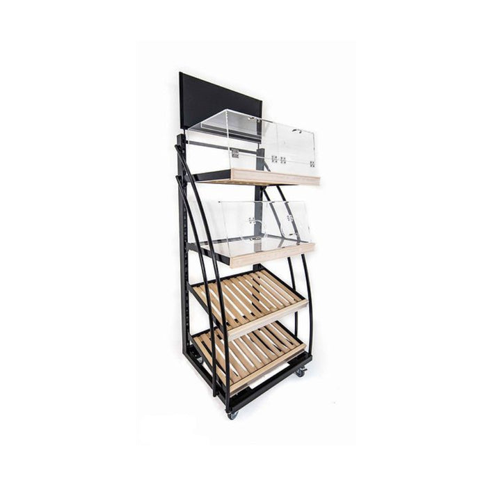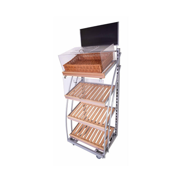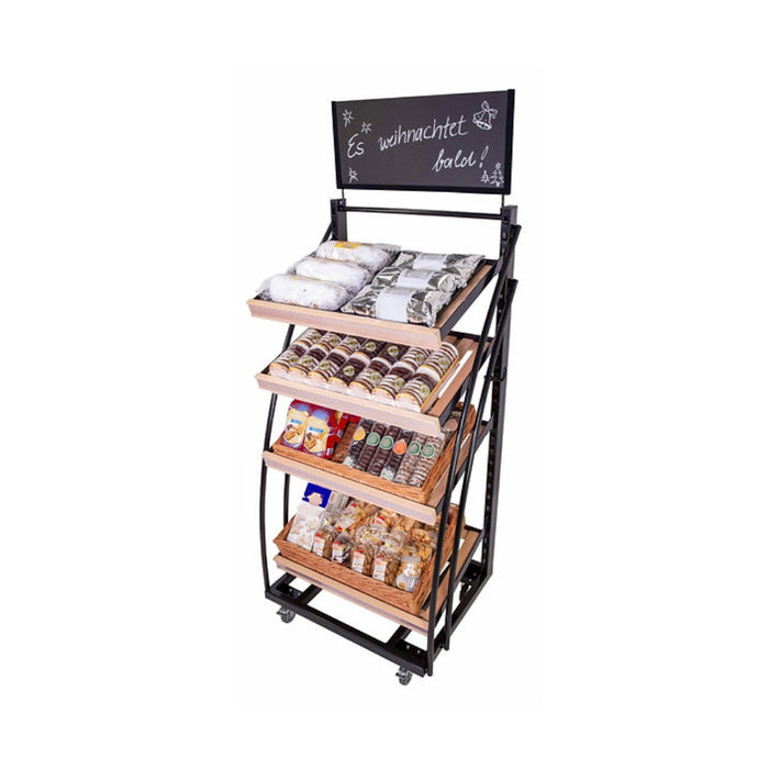 Dieser Verkaufsständer in hochwertiger Ausführung ist ein multifunktionaler Ladenständer, der sich perfekt an Ihre Bedürfnisse anpasst. Die Grundausstattung umfasst 4 stabile Holzlattenroste aus Buche sowie eine große Kreidetafel/Werbetafel (schwarz oder silber). Optional kann der Aktionsständer mit Tabletts, Weidekörben, Tütenhalter oder Abdeck- und Spuckschutzhauben erweitert werden. Mit nur 73 cm Breite benötigt der Ständer kaum Platz und lässt sich durch Rollen flexibel im Geschäft verschieben.