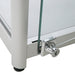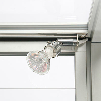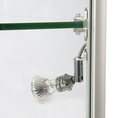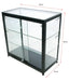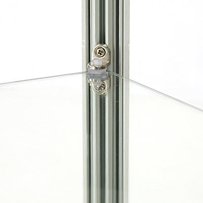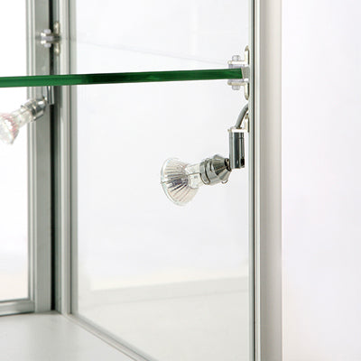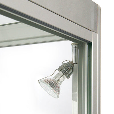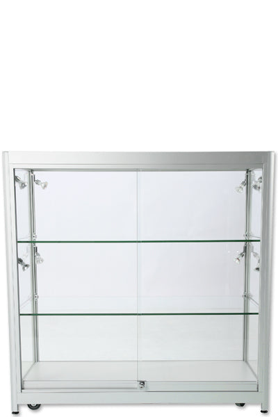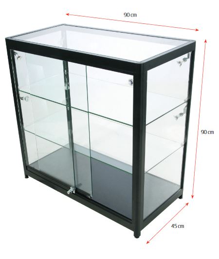 Exklusive Vitrine aus Aluminiumprofilen und gehärtetem Glas mit 2 Stück 7 mm Glasablagen. Ausgestattet mit 3 LED-Leuchten in der Seite und 4 Rädern (2 mit Bremse), und Stellschrauben an den Beinen. Schiebetüren sind abschließbar.