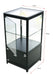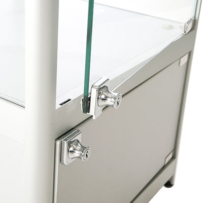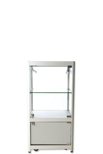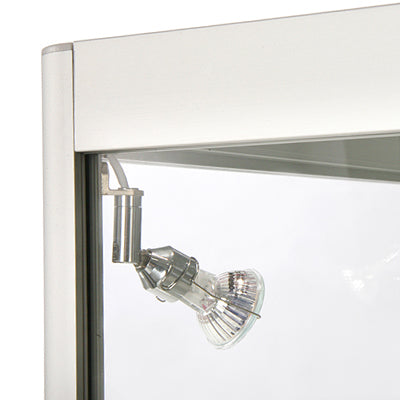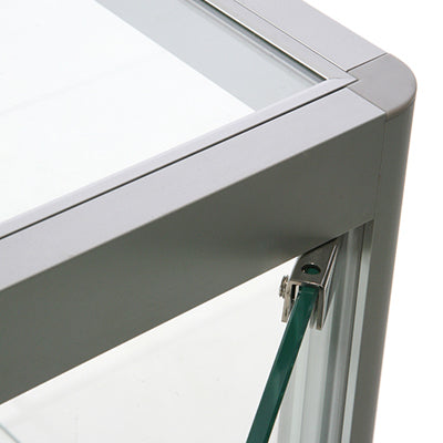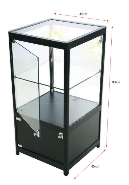 Exklusive Vitrine aus Aluminiumprofilen und gehärtetem Glas mit Schrank aus Melamin und 7 mm Glasablage. Ausgestattet mit 3 LED-Leuchten in der Seite und 4 Rädern (2 mit Bremse), und Stellschrauben an den Beinen. Die Tür hat Scharniere auf der rechten Seite und ist abschließbar.