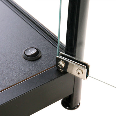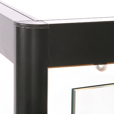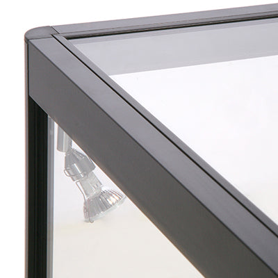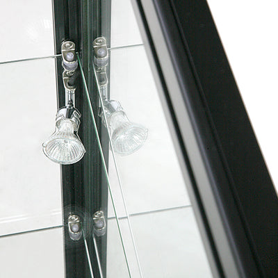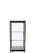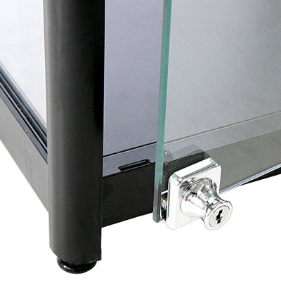 Exklusive Vitrine aus Aluminiumprofilen und gehärtetem Glas mit 2 Stück 7 mm Glasablagen. Ausgestattet mit 3 LED-Leuchten in der Seite und 4 Rädern (2 mit Bremse), und Stellschrauben an den Beinen. Die Tür hat Scharniere auf der rechten Seite und ist abschließbar.