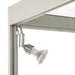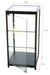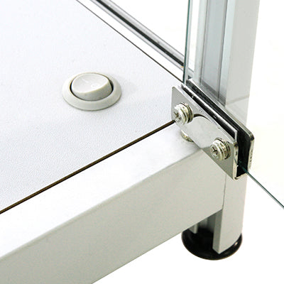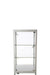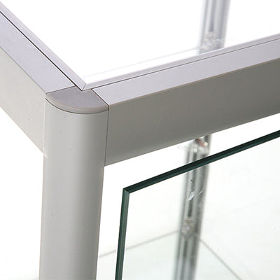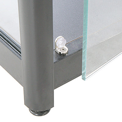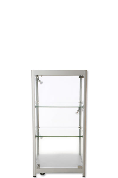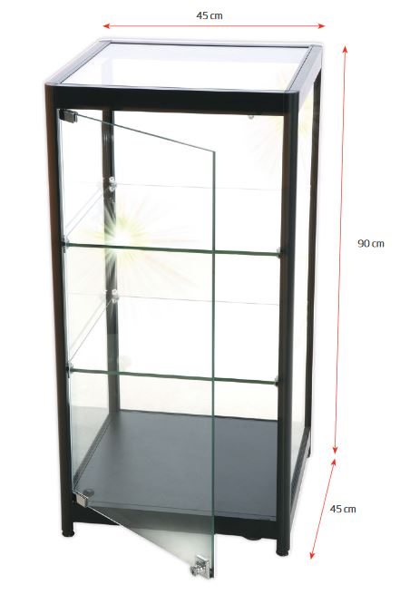 Exklusive Vitrine aus Aluminiumprofilen und gehärtetem Glas mit 2 Stück 7 mm Glasablagen. Ausgestattet mit 3 LED-Leuchten in der Seite und 4 Rädern (2 mit Bremse), und Stellschrauben an den Beinen. Die Tür hat Scharniere auf der rechten Seite und ist abschließbar.
